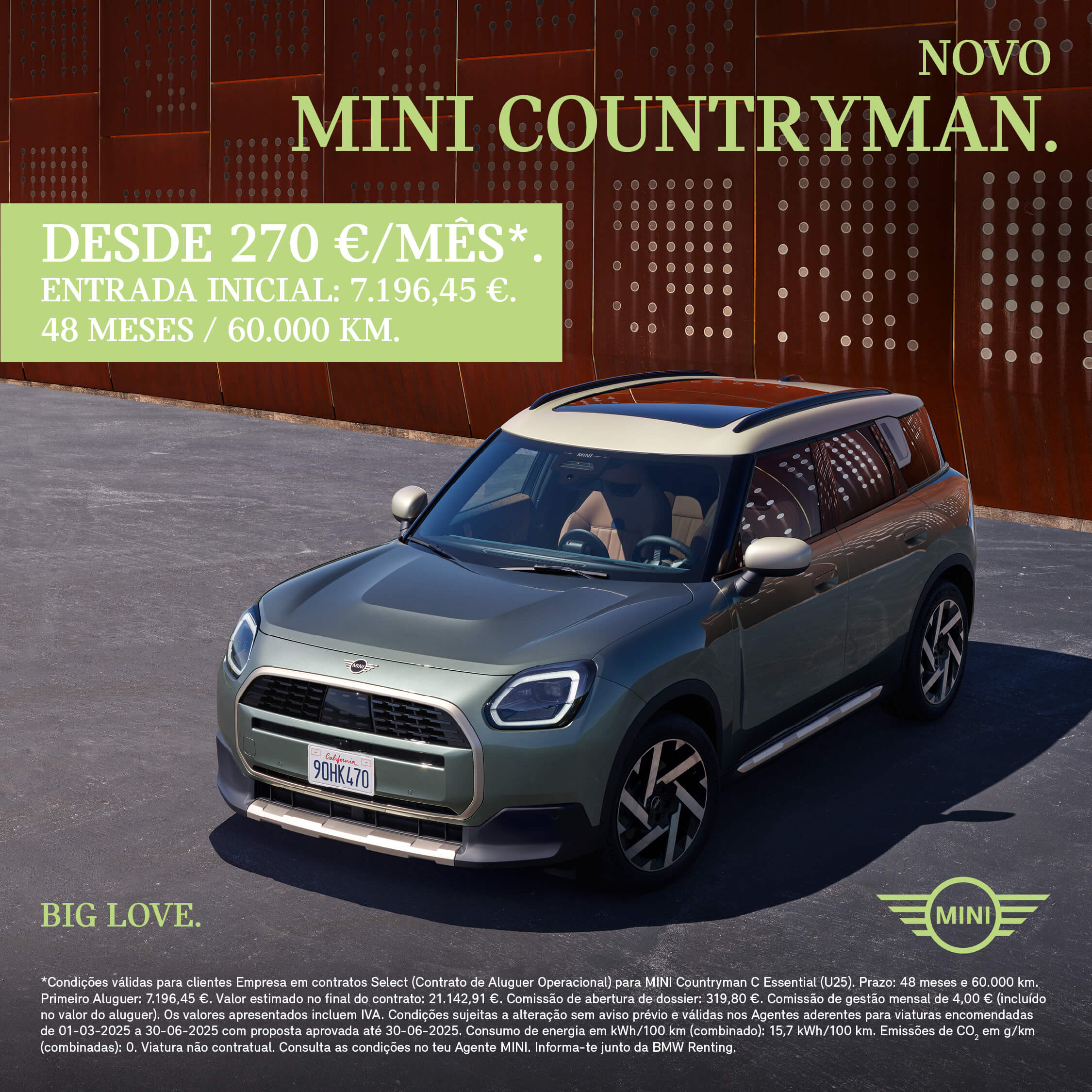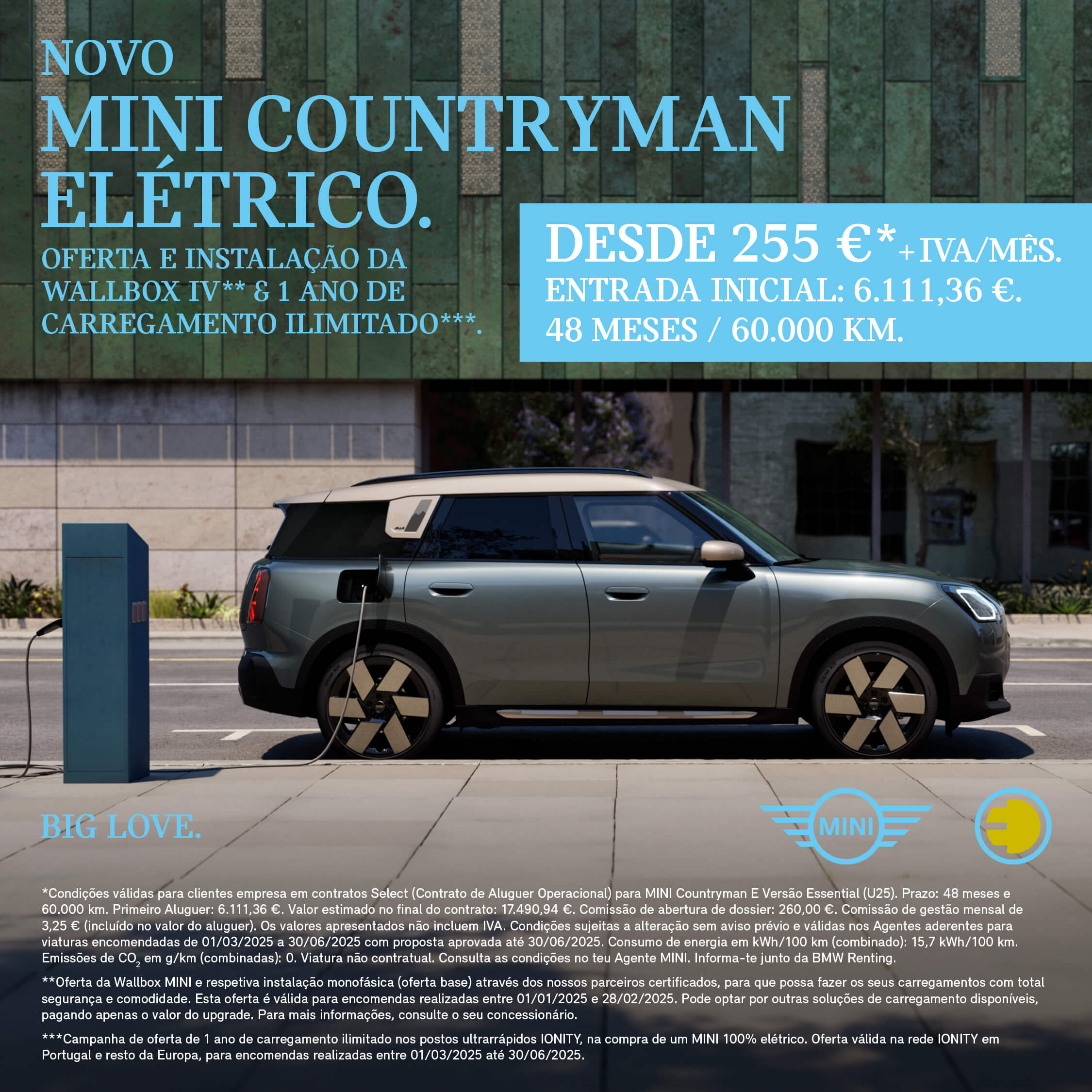 O MINI Countryman Elétrico combina o design icónico da marca com tecnologia sustentável, oferecendo uma autonomia até 462 km (WLTP). Equipado com uma bateria de 64,6 kWh, permite carregamentos rápidos de 10% a 80% em apenas 29 minutos. Com capacidade para 5 passageiros e bagageira expansível até 1.450 litros, é ideal para famílias que procuram um SUV elétrico espaçoso.