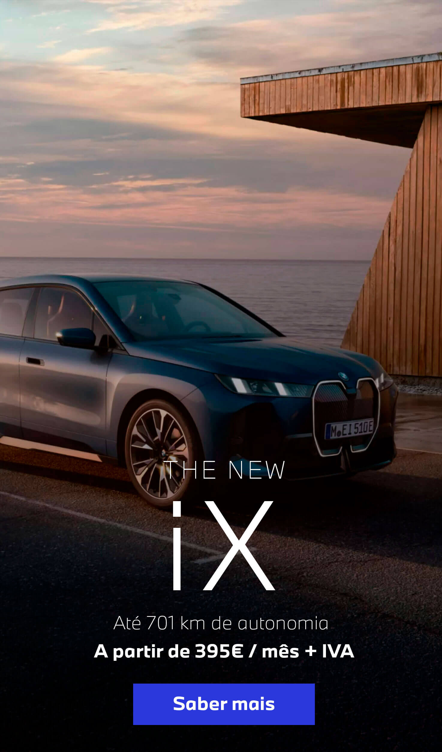 * Condições válidas para clientes Empresa em contratos Select (Contrato de Aluguer Operacional) para BMW iX xDrive45 (I20). Prazo: 60 meses e 80.000km. Primeiro Aluguer: 12.173,24€. Valor estimado no final do contrato: 34.132,57€. Comissão de abertura de dossier: 260,00€. Comissão de gestão mensal de 3,25€. Os valores apresentados não incluem IVA. Condições sujeitas a alteração sem aviso prévio e válidas nos Concessionários aderentes para viaturas encomendadas de 01-04-2025 a 30-06-2025 com proposta aprovada até 30-06-2025. Consumo de energia em kWh/100 km (combinado): 17,8 kWh/100 Km. Emissões de CO2 em g/km (combinadas): 0. Viatura não contratual. Consulte as condições no seu Concessionário BMW. Informe-se junto da BMW Renting.