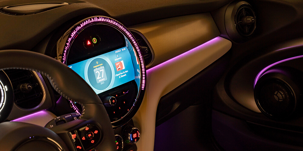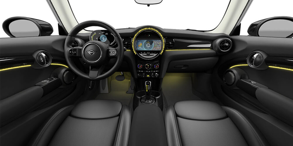 O interior MINI Eco-Pele Carbon Black é a fusão perfeita de luxo, sustentabilidade e inovação.